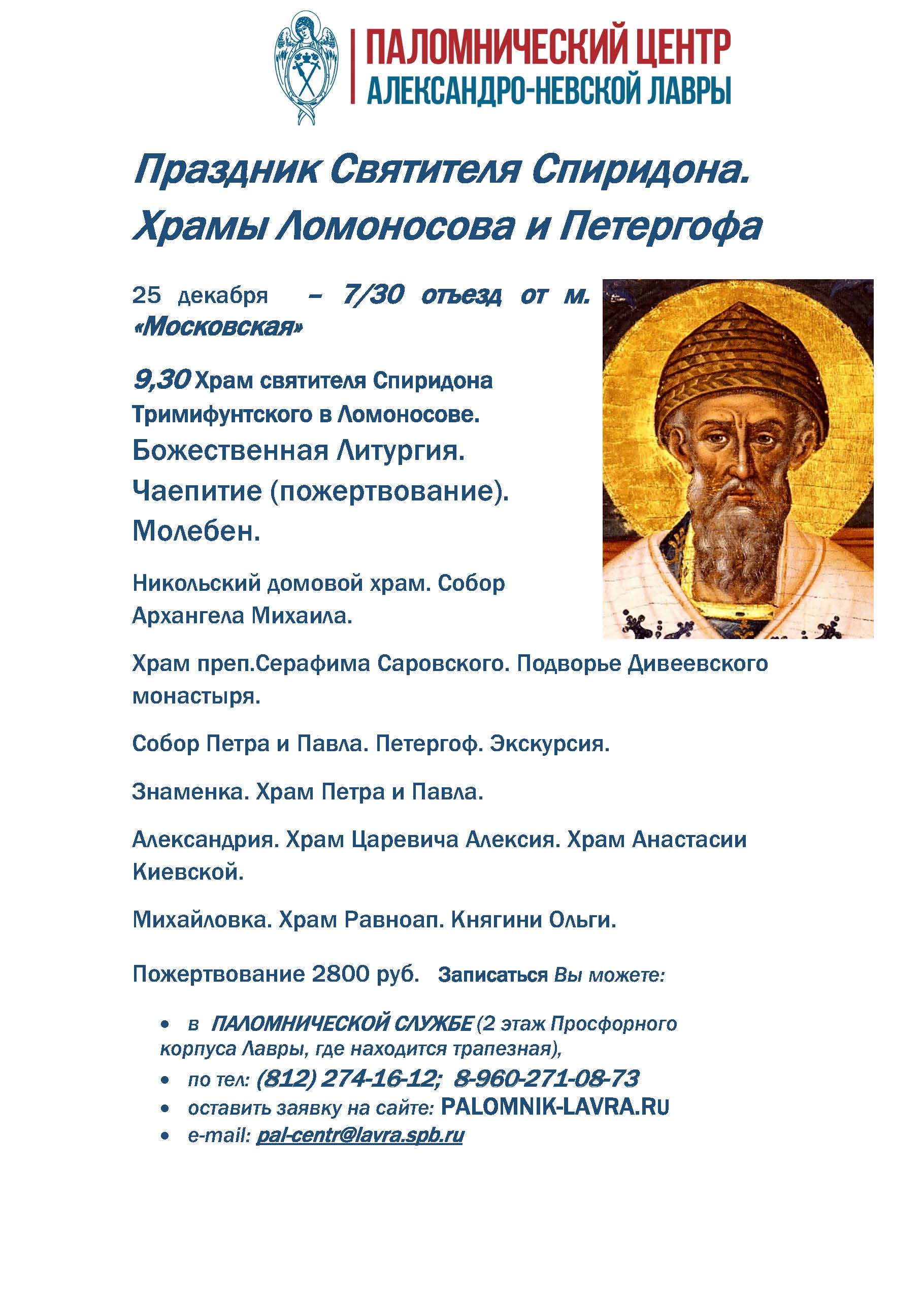 Праздник Святителя Спиридона. Храмы Ломоносова и Петергофа