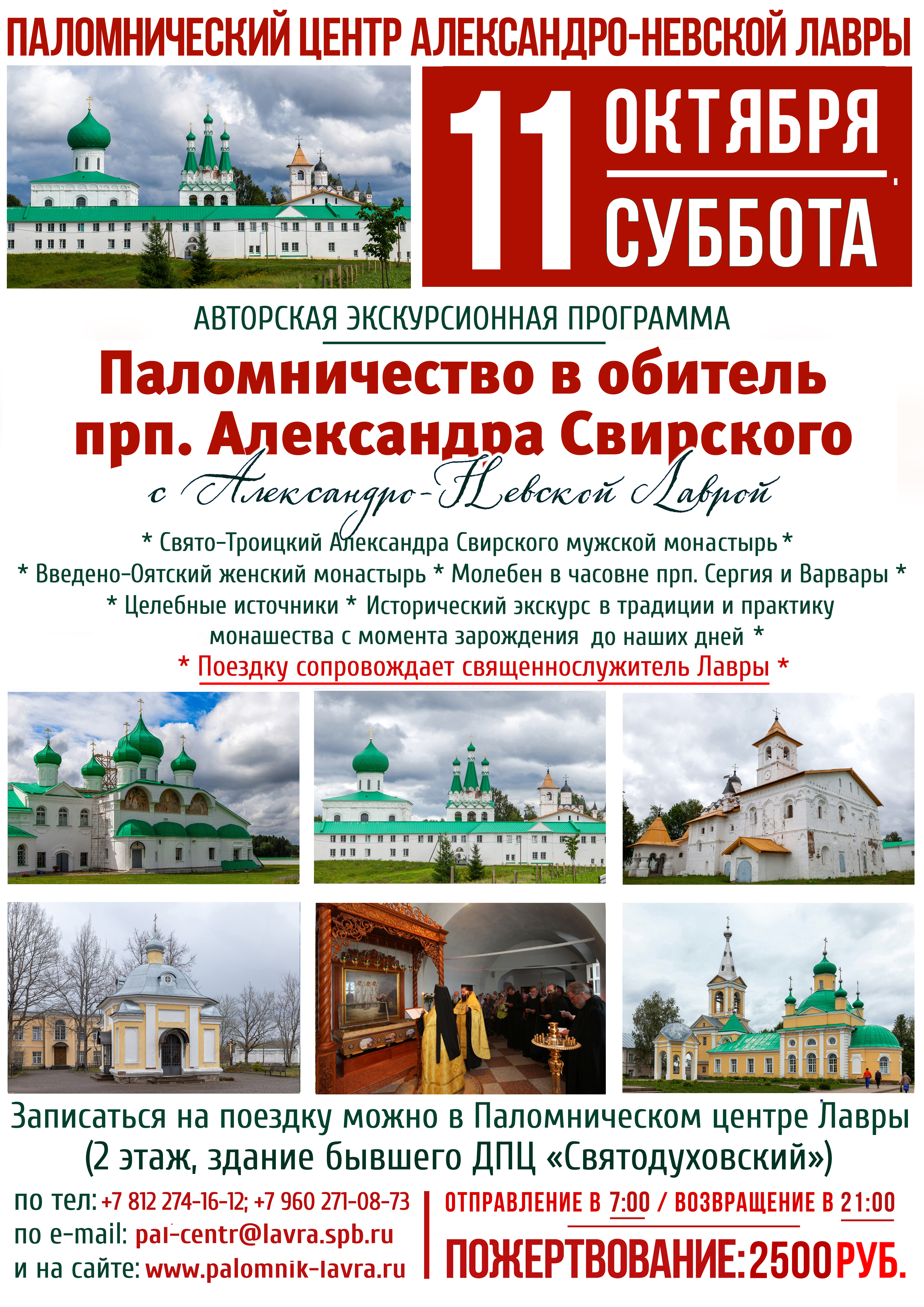 Александра Свирского Свято-Троицкий мужской и Введено-Оятский женский монастырь | 2500+300 экскурс. | 7.00-22.00 | 4,11,18,25 | 2,8,15,22,29 | 6,13,27 | 3,10,19,24 |