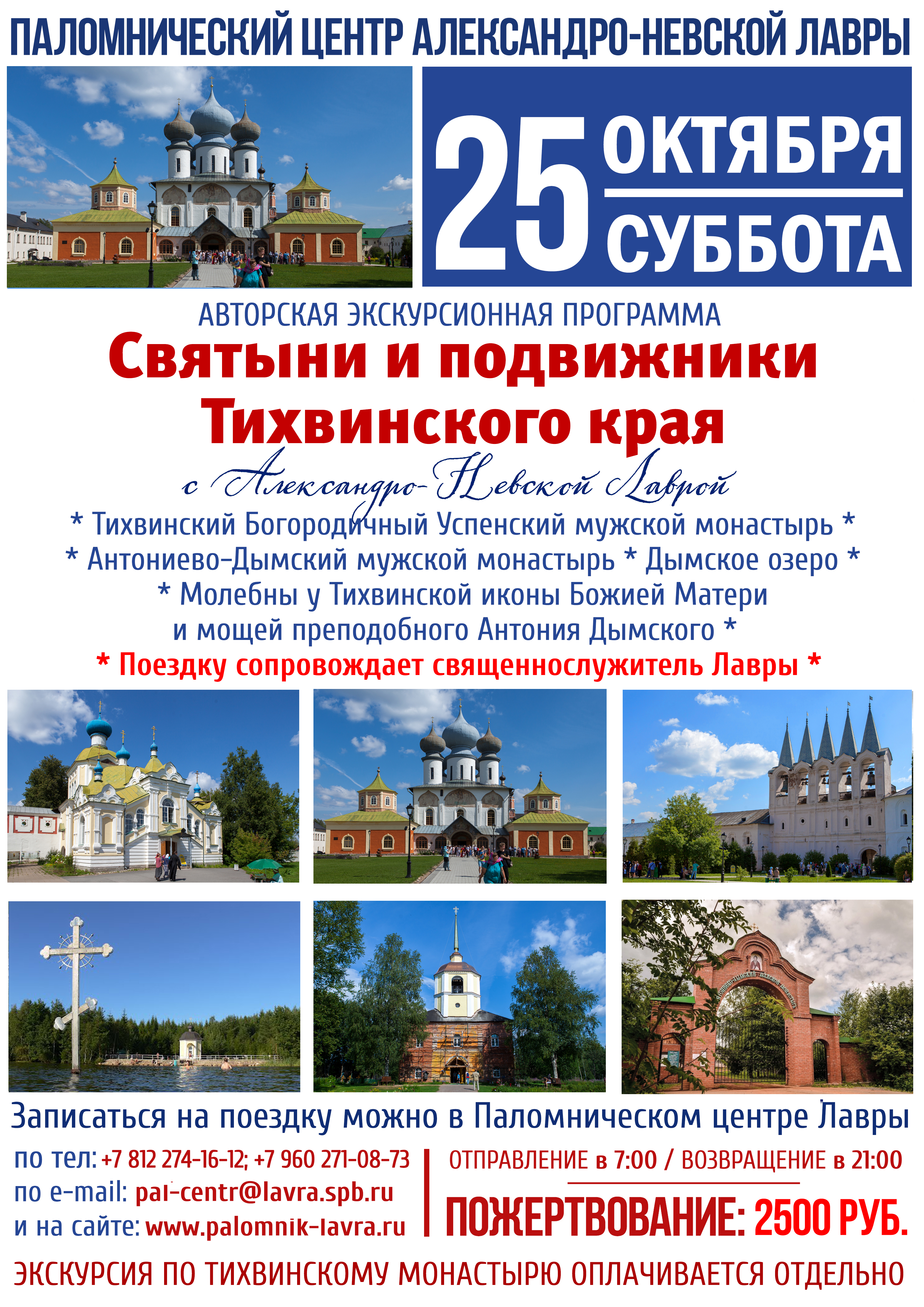 Тихвинский и Антониево-Дымский монастыри | 2500+400 экск | 7.00-21.00 | 4,12,25 | 3,15,30 | 7,20 | 5,17 |
