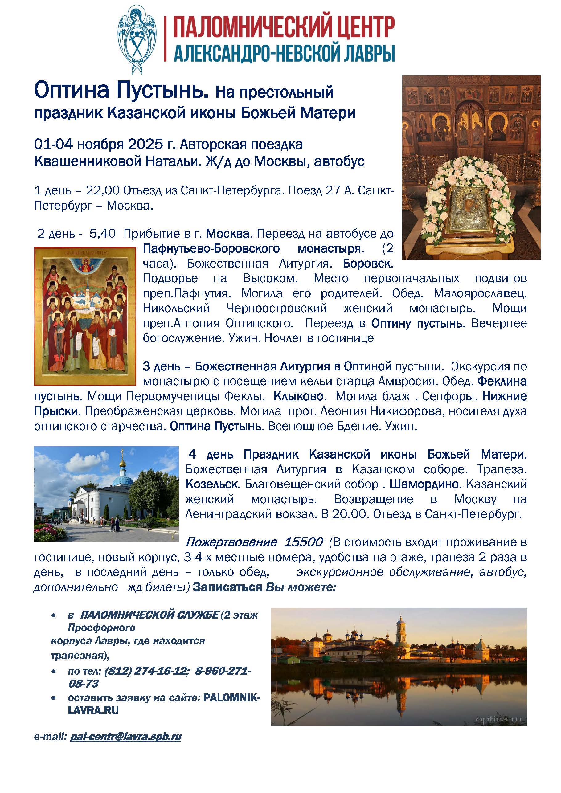 пожертвование за обзорную экскурсию по Лавре (проводится ежедневно в 12.00, 14.00 и 16.00.)  будет составлять: